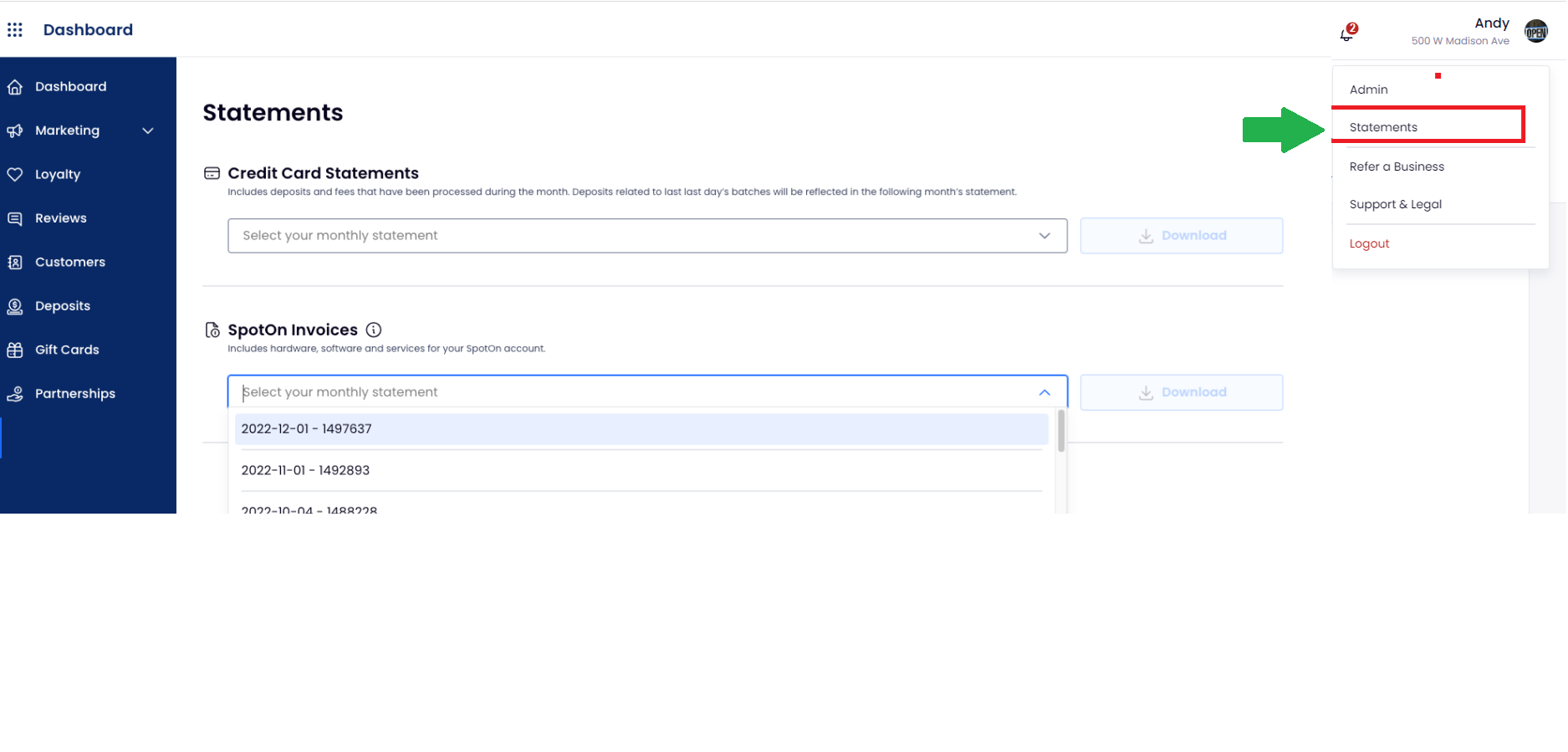 • Summary: The Statements page in SpotOn Dashboard has been moved to the main left navigation from the top right avatar navigation to promote a more intuitive flow for accessing this popular page.